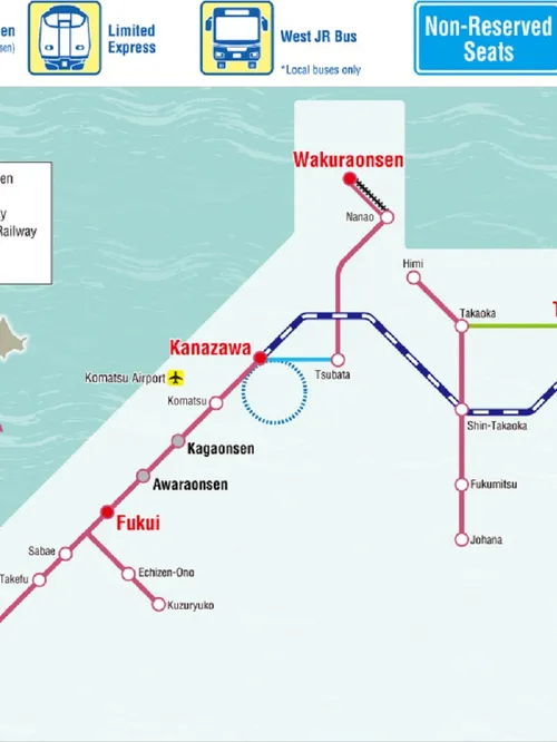- Unlimited travel on local JR trains and buses in designated areas of the Hokuriku region (Toyama, Ishikawa, and Fukui).