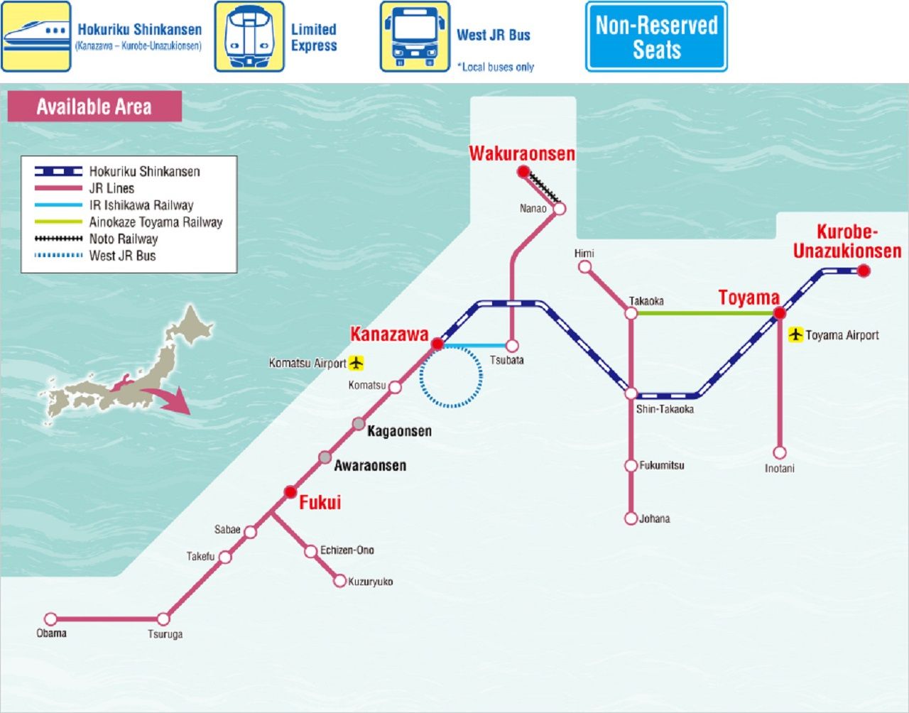 - Unlimited travel on local JR trains and buses in designated areas of the Hokuriku region (Toyama, Ishikawa, and Fukui).