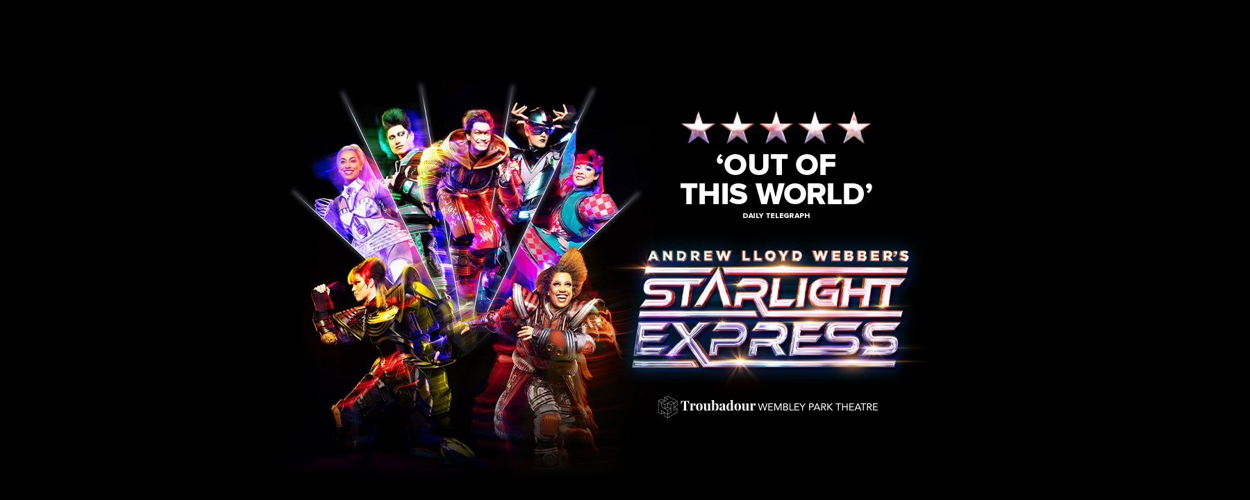 No printing. Mobile tickets accepted- Catch Andrew Lloyd Webber’s Starlight Express now playing in the specially designed Starlight Auditorium at Troubadour Wembley Park Theatre.