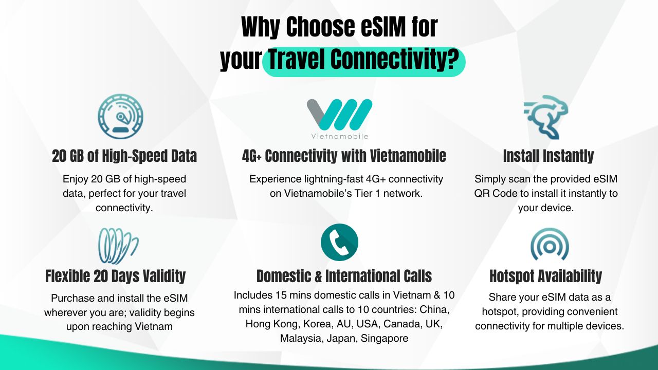 - Enjoy seamless internet access with the convenience of an eSIM while traveling in Vietnam.