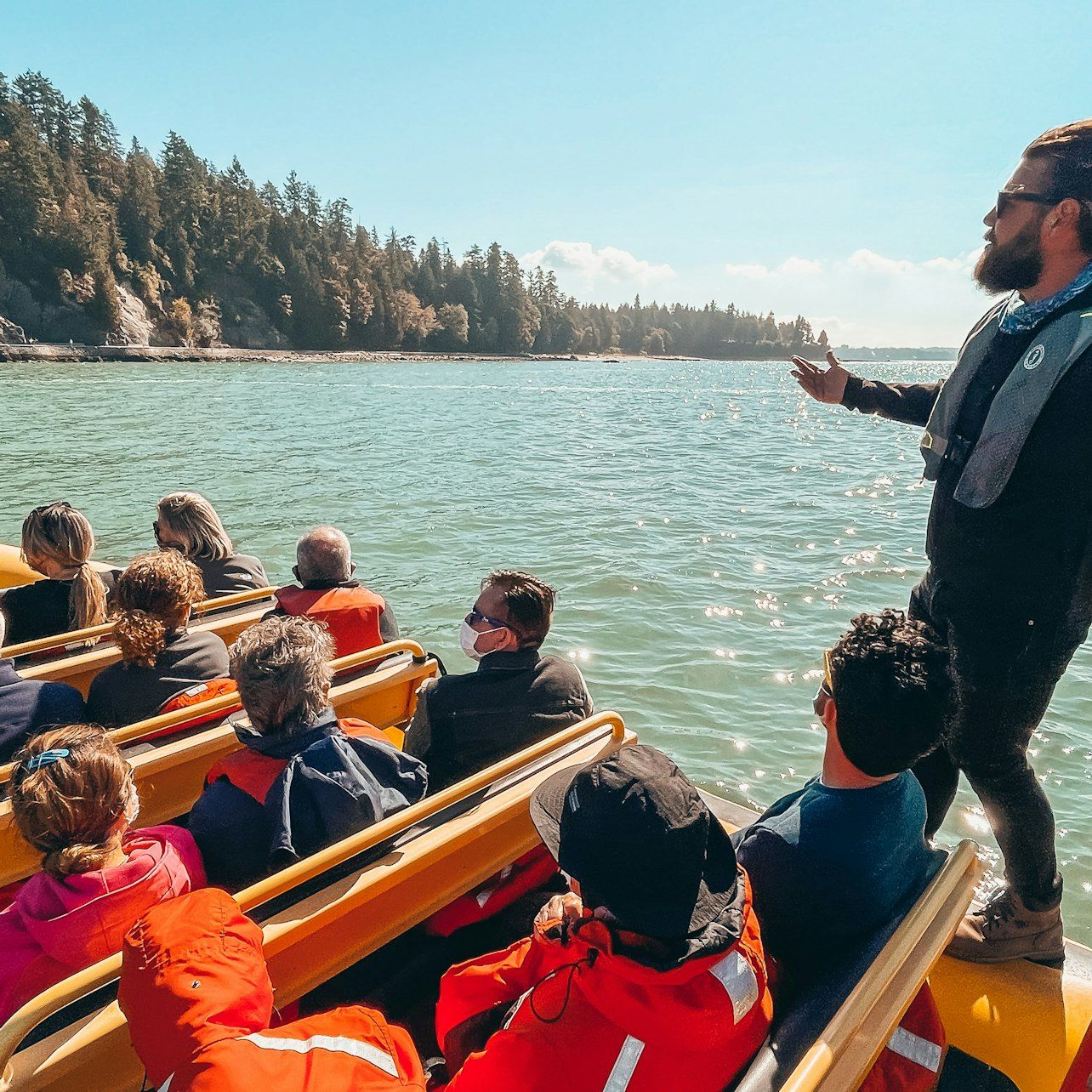 Board an openair, 12seater zodiac boat from the scenic False Creek.